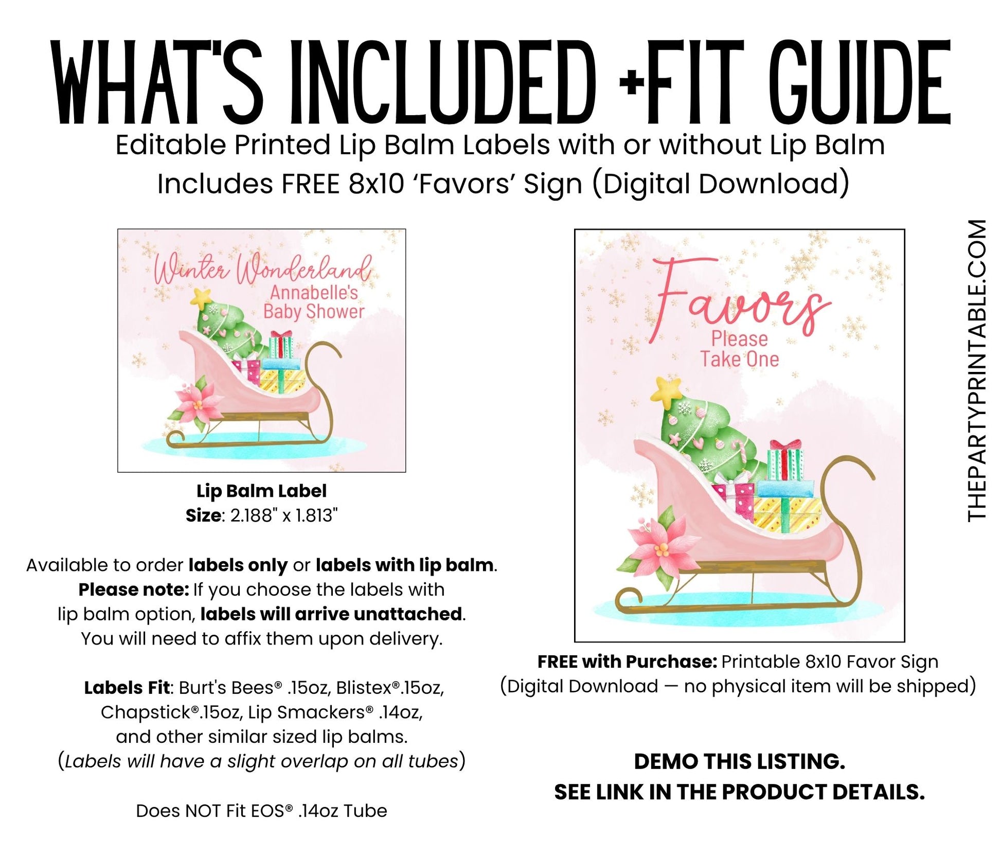 Thank your guests with these Pink Sleigh Baby Shower lip balm favors! Featuring a snowy sleigh design in pink, these chapstick favors are perfect for a girl’s Winter Wonderland baby shower. Choose printed favors as labels only, or upgrade to include lip balms (vanilla flavor). Labels arrive unattached for easy assembly—just peel and wrap around each balm tube. You’ll edit the design in Corjl and click “Approve.” Once approval is received, your order will be printed on matte weatherproof labels and shipped. (See specs below.)