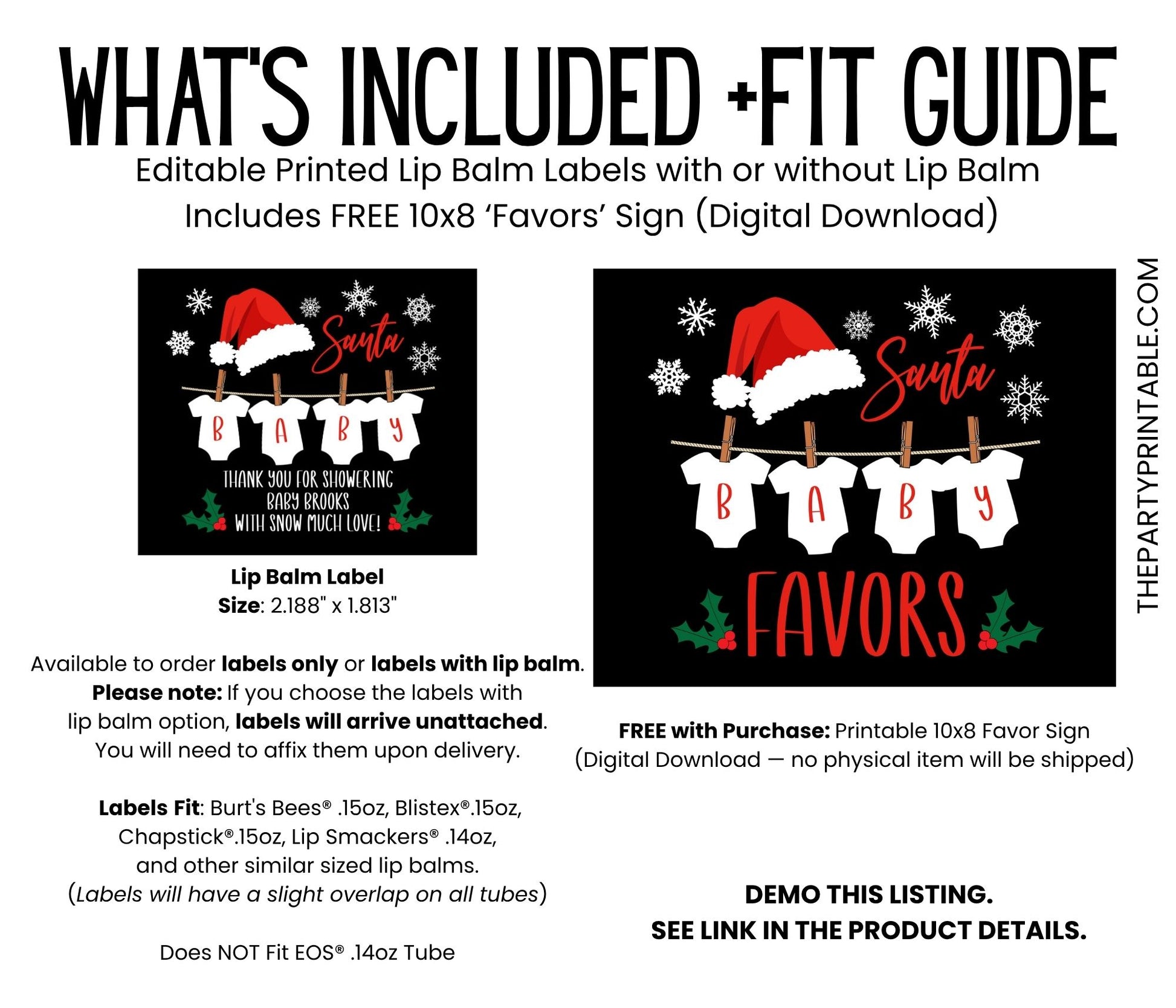 Thank your guests with these Santa Baby lip balm favors! Featuring festive onesies with a Santa hat design, these chapstick favors are the perfect touch for a Christmas baby shower or holiday gender reveal. Available for boy or girl themes. Choose printed favors as labels only, or upgrade to include lip balms (vanilla flavor). Labels arrive unattached for easy assembly—just peel and wrap around each balm tube. You’ll edit the design in Corjl and click “Approve.” Once approval is received, your order will be printed on matte weatherproof labels and shipped. (See specs below.)