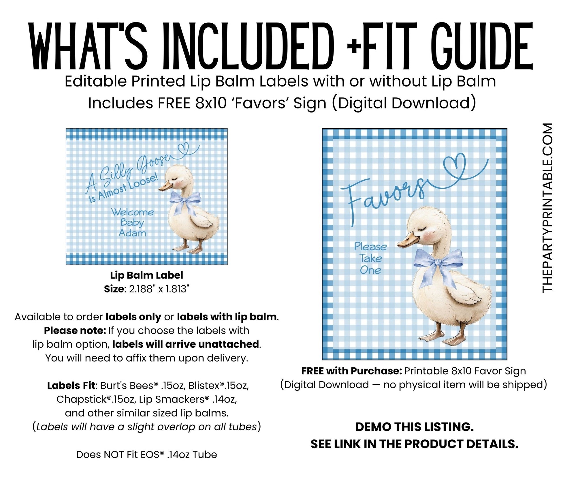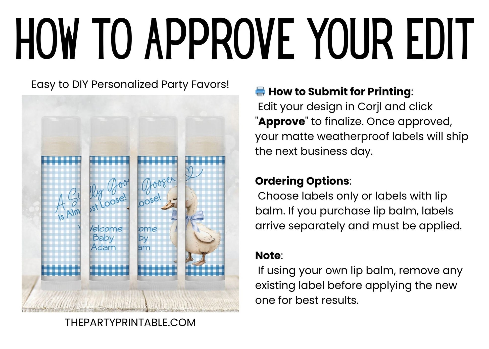 Celebrate the little one on the way with these Silly Goose Is Almost Loose chapstick favors! Featuring a playful blue design, these lip balm favors are perfect for a boy baby shower. A sweet and practical way to thank your guests. Choose printed favors as labels only, or upgrade to include lip balms (vanilla flavor). Labels arrive unattached for easy assembly—just peel and wrap around each balm tube. You’ll edit the design in Corjl and click “Approve.” Once approval is received, your order will be printed on matte weatherproof labels and shipped. (See specs below.)