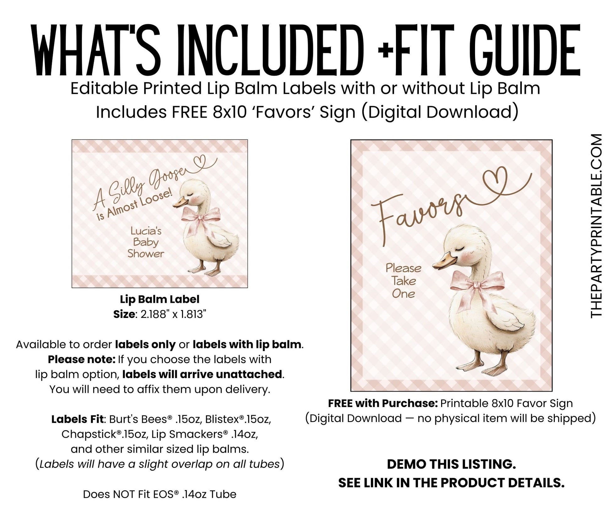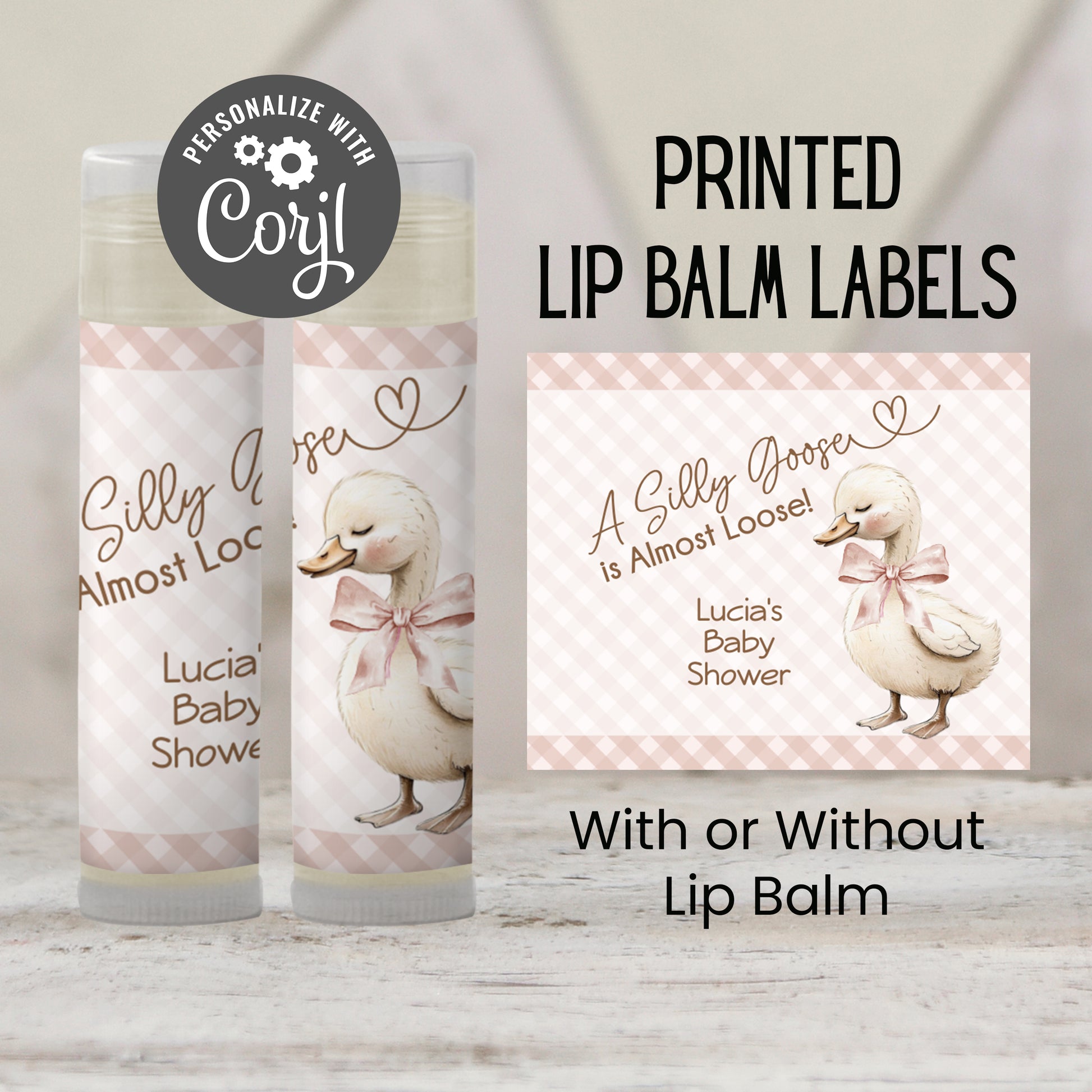 Celebrate with a giggle using these Silly Goose Is Almost Loose chapstick favors! Featuring a peach design with playful charm, these lip balm favors are perfect for a gender-neutral baby shower. A fun and practical way to thank your guests. Choose printed favors as labels only, or upgrade to include lip balms (vanilla flavor). Labels arrive unattached for easy assembly—just peel and wrap around each balm tube. You’ll edit the design in Corjl and click “Approve.” Once approval is received, your order will be printed on matte weatherproof labels and shipped. (See specs below.)
