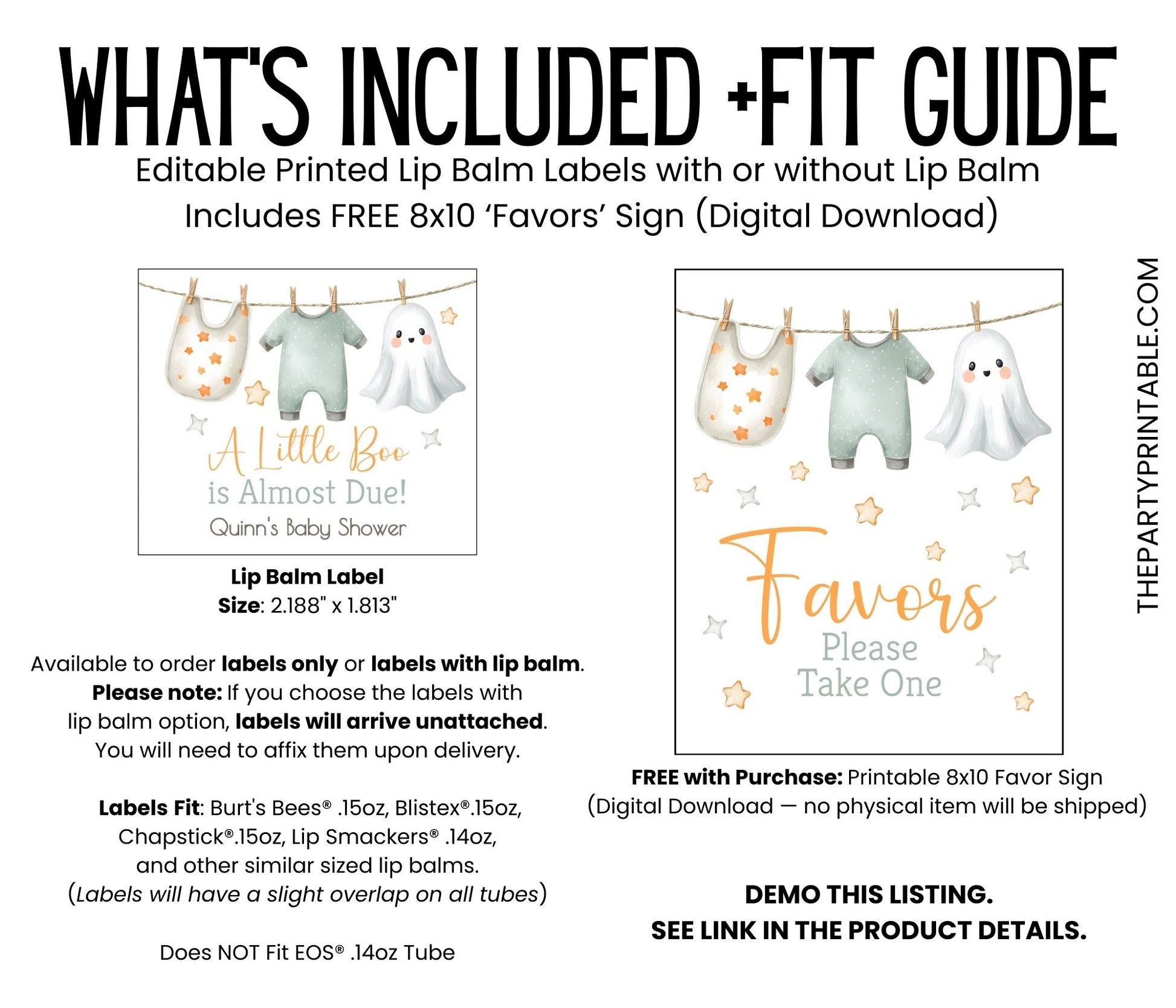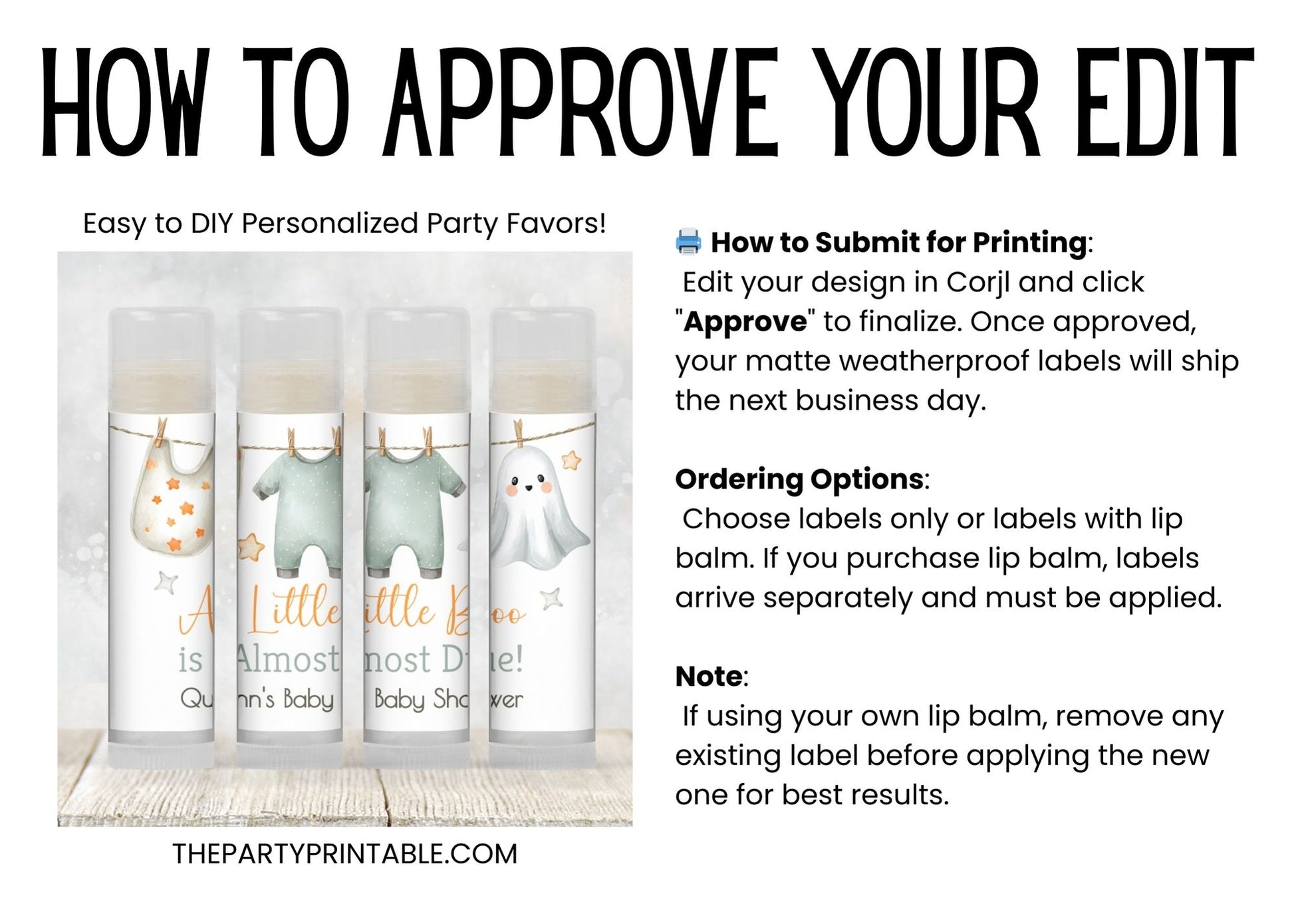 Celebrate your little boo with these adorable chapstick favors! Featuring a ghost and baby clothesline in gender-neutral colors, these A Little Boo Is Almost Due lip balm favors are perfect for a fall or October baby shower. A spooky-cute and practical way to thank your guests. Choose printed favors as labels only, or upgrade to include lip balms (vanilla flavor). Labels arrive unattached for easy assembly—just peel and wrap around each balm tube. You’ll edit the design in Corjl and click “Approve.” Once approval is received, your order will be printed on matte weatherproof labels and shipped. (See specs below.)