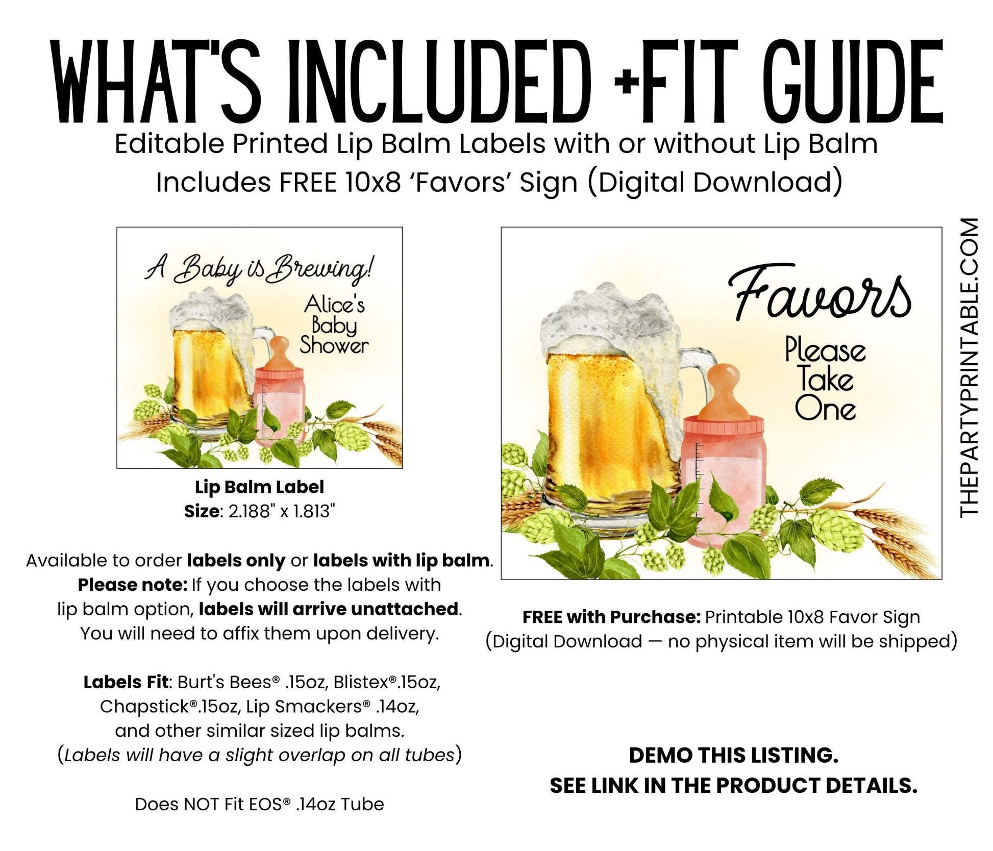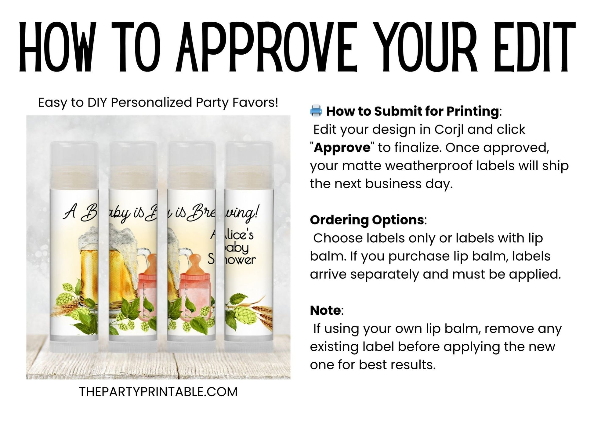 Cheers to the parents-to-be! These Baby Is Brewing lip balm favors feature a playful beer theme, making them the perfect guest gift for a girl baby shower. Designed to celebrate mom or both parents, these chapstick favors bring a fun twist to your party while giving guests a practical thank-you gift. Choose printed favors as labels only, or upgrade to include lip balms (vanilla flavor). Labels arrive unattached for easy assembly—just peel and wrap around each balm tube. You’ll edit the design in Corjl and click “Approve.” Once approval is received, your order will be printed on matte weatherproof labels and shipped. (See specs below.)