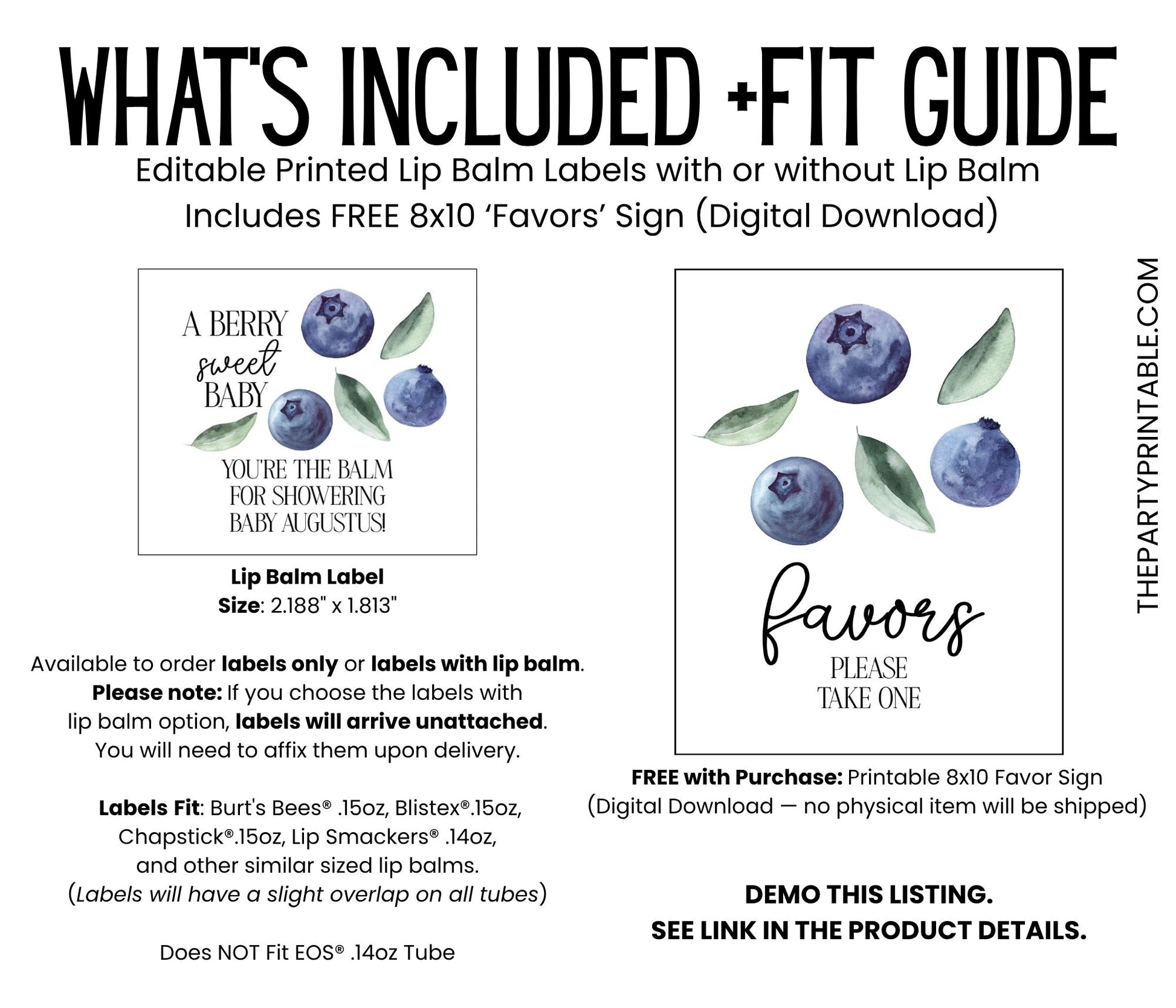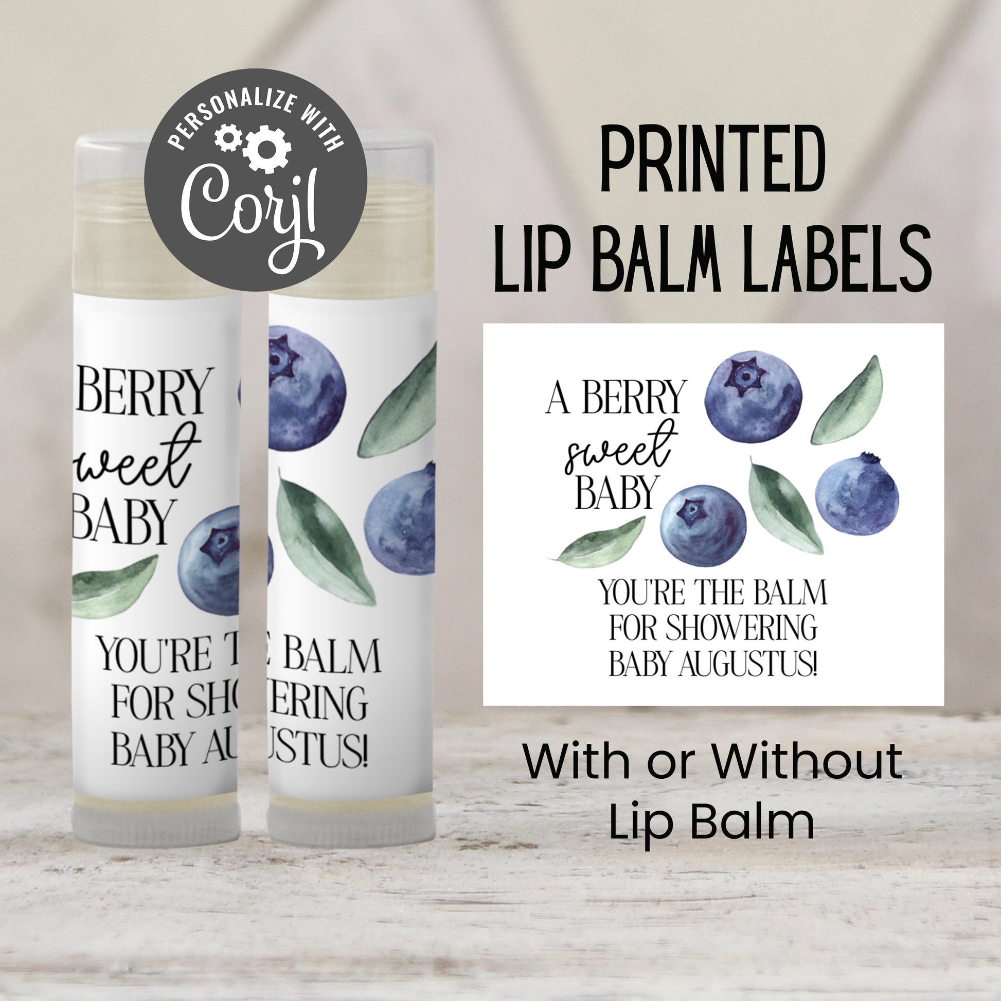 Thank your guests with these sweet Blueberry Baby Shower lip balm favors! Featuring a fresh fruit design in blue, these chapstick favors are perfect for celebrating a boy baby shower or summer party. A thoughtful and practical guest gift family and friends will enjoy. Choose printed favors as labels only, or upgrade to include lip balms (vanilla flavor). Labels arrive unattached for easy assembly—just peel and wrap around each balm tube. You’ll edit the design in Corjl and click “Approve.” Once approval is received, your order will be printed on matte weatherproof labels and shipped. (See specs below.)