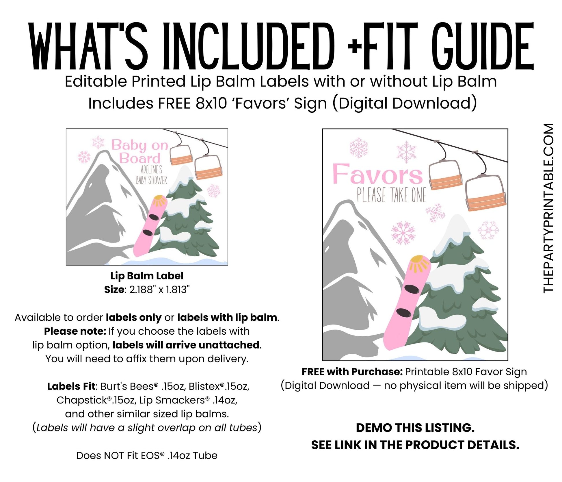 Thank your guests with these Baby on Board snowboard chapstick favors—perfect for a pink winter or mountain-themed girl baby shower. Featuring a snowboard design with seasonal accents, these practical favors are a unique way to celebrate your little one. Choose labels only, or upgrade to include vanilla lip balms. Labels arrive unattached, so you can easily peel and apply them when you’re ready to assemble your favors. You’ll edit the labels in Corjl and click “Approve.” Once approval is received, your order will be printed on matte weatherproof labels and shipped. (See specs below.)