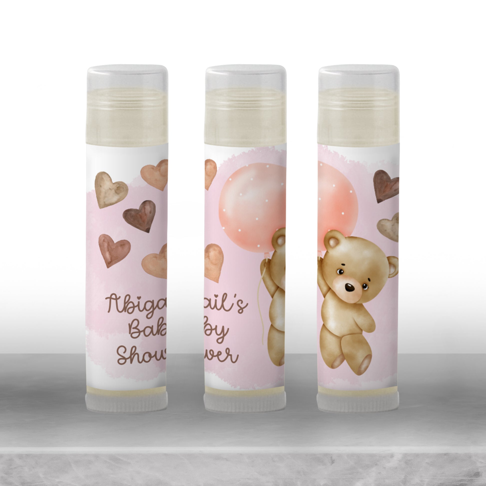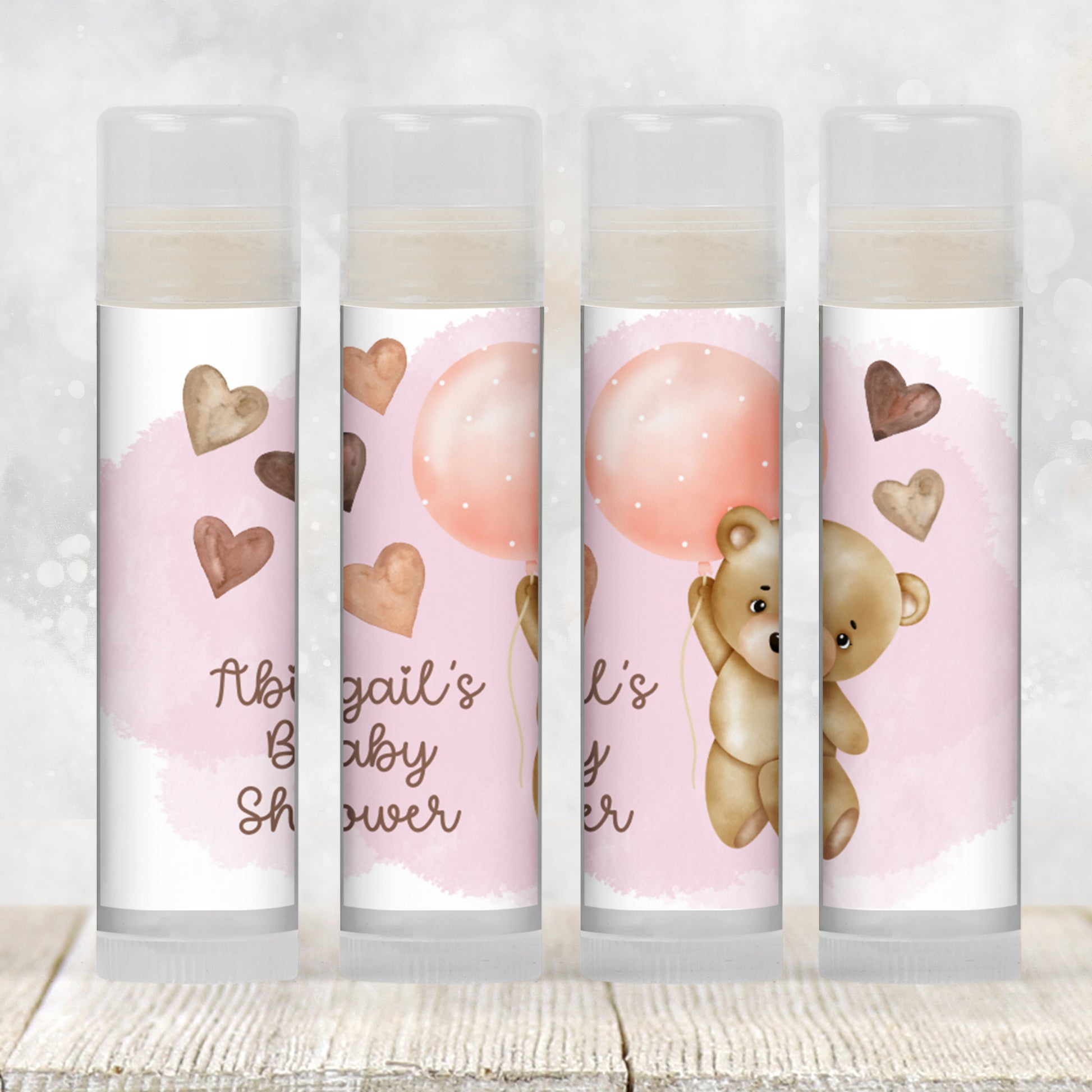 Teddy Bear Baby Shower Favors Lip Balm: Pink Balloon Girl Guest Gift