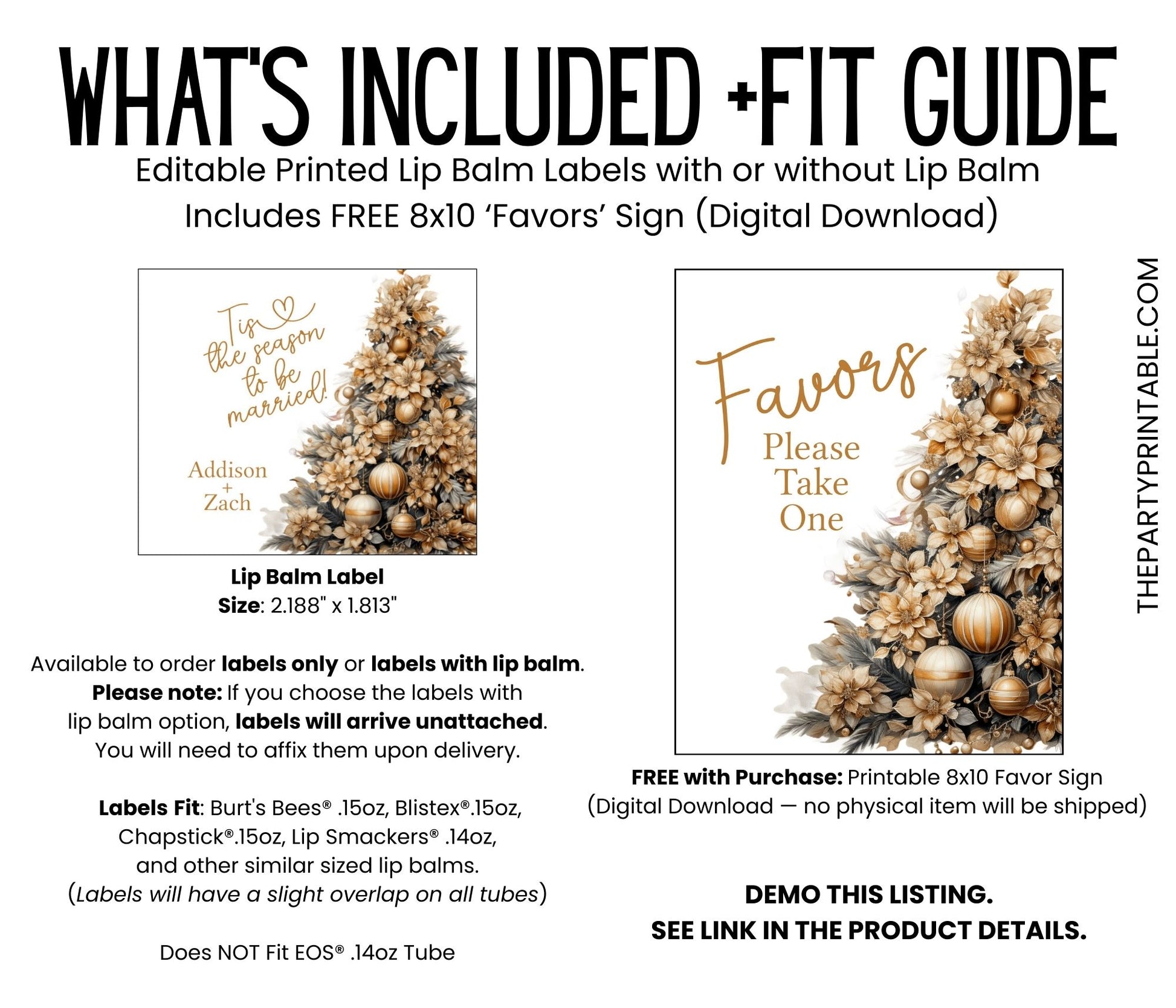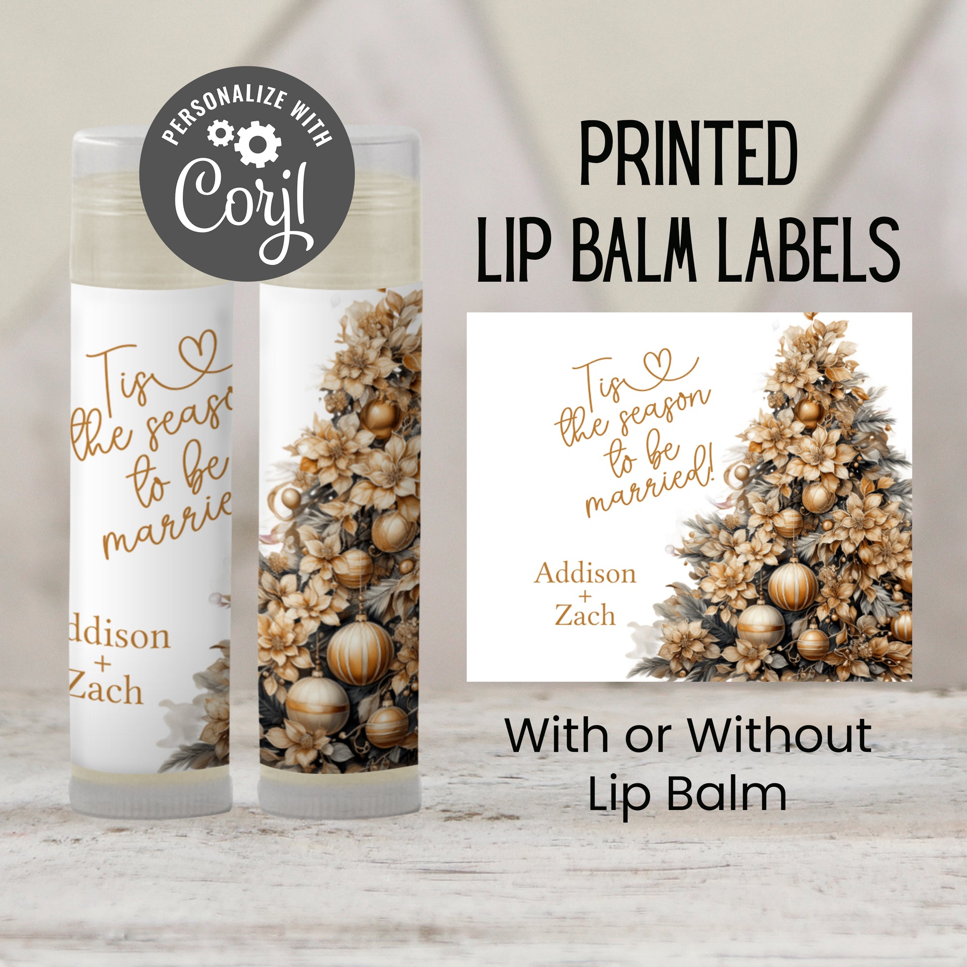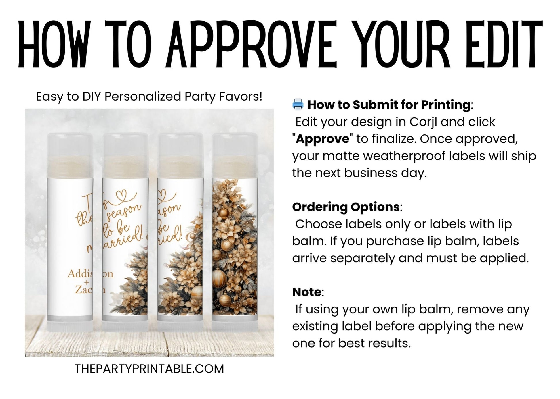’Tis the season to celebrate with these festive chapstick favors! Featuring a gold Christmas tree design, these ’Tis the Season to Be Married lip balm favors are perfect for a holiday wedding, Christmas bridal shower, or winter bachelorette party. A fun and practical way to thank your guests. Choose printed favors as labels only, or upgrade to include lip balms (vanilla flavor). Labels arrive unattached for easy assembly—just peel and wrap around each balm tube. You’ll edit the design in Corjl and click “Approve.” Once approval is received, your order will be printed on matte weatherproof labels and shipped. (See specs below.)