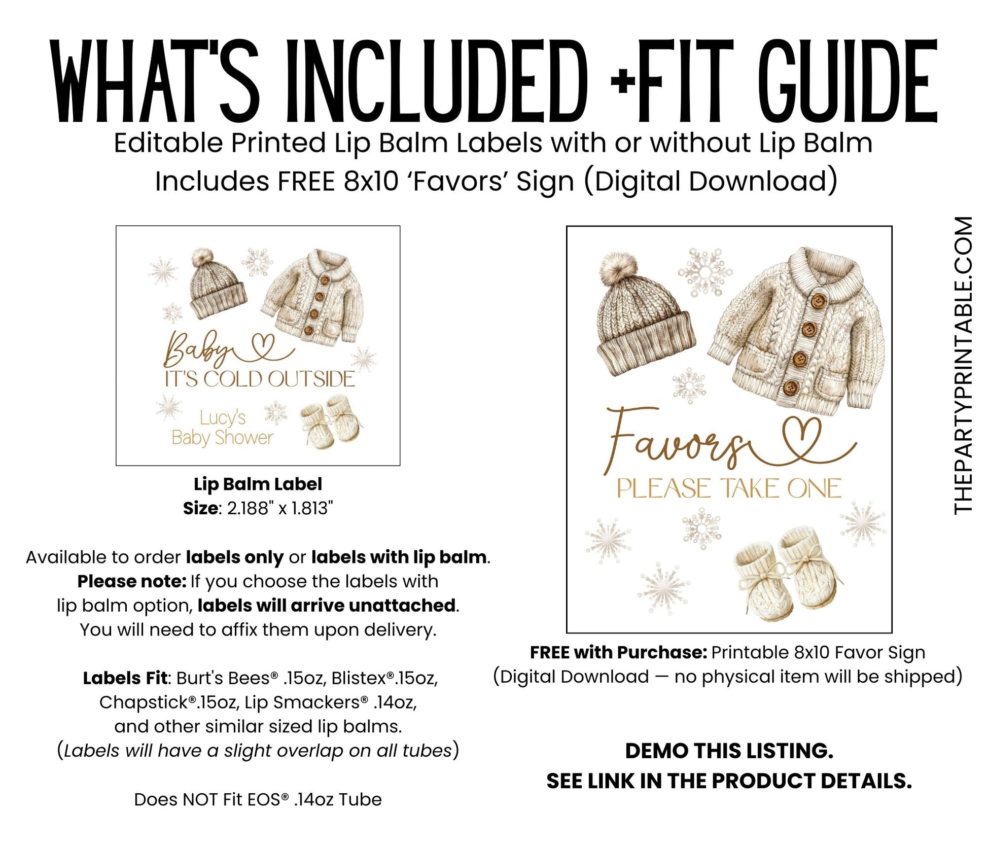 Warm up your winter celebration with these Baby It’s Cold Outside chapstick favors! Featuring baby clothes on a winter clothesline surrounded by falling snowflakes, these lip balm favors are perfect for a gender-neutral baby shower or snowy season party. A cozy and practical way to thank your guests. Choose printed favors as labels only, or upgrade to include lip balms (vanilla flavor). Labels arrive unattached for easy assembly—just peel and wrap around each balm tube. You’ll edit the design in Corjl and click “Approve.” Once approval is received, your order will be printed on matte weatherproof labels and shipped. (See specs below.)