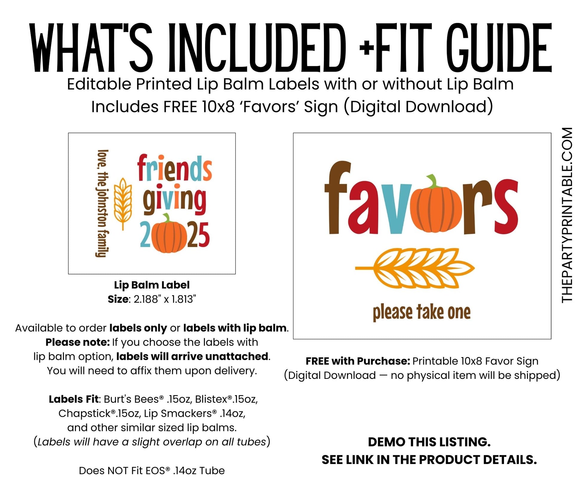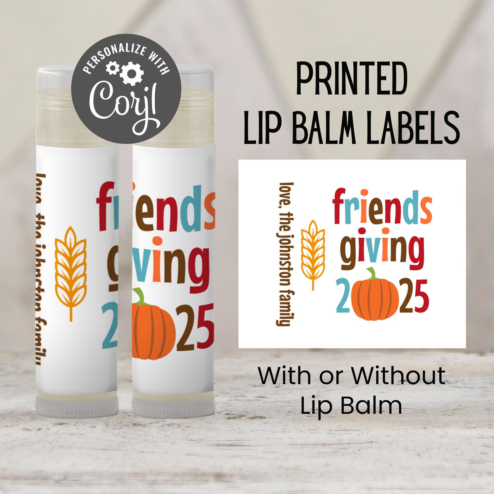 Celebrate friendship with these personalized Friendsgiving lip balm favors! Featuring a festive design, these chapstick favors are perfect for Friendsgiving dinners, brunches, or fall parties. A thoughtful and practical guest gift your friends will love. Choose printed favors as labels only, or upgrade to include lip balms (vanilla flavor). Labels arrive unattached for easy assembly—just peel and wrap around each balm tube. You’ll edit the design in Corjl and click “Approve.” Once approval is received, your order will be printed on matte weatherproof labels and shipped. (See specs below.)