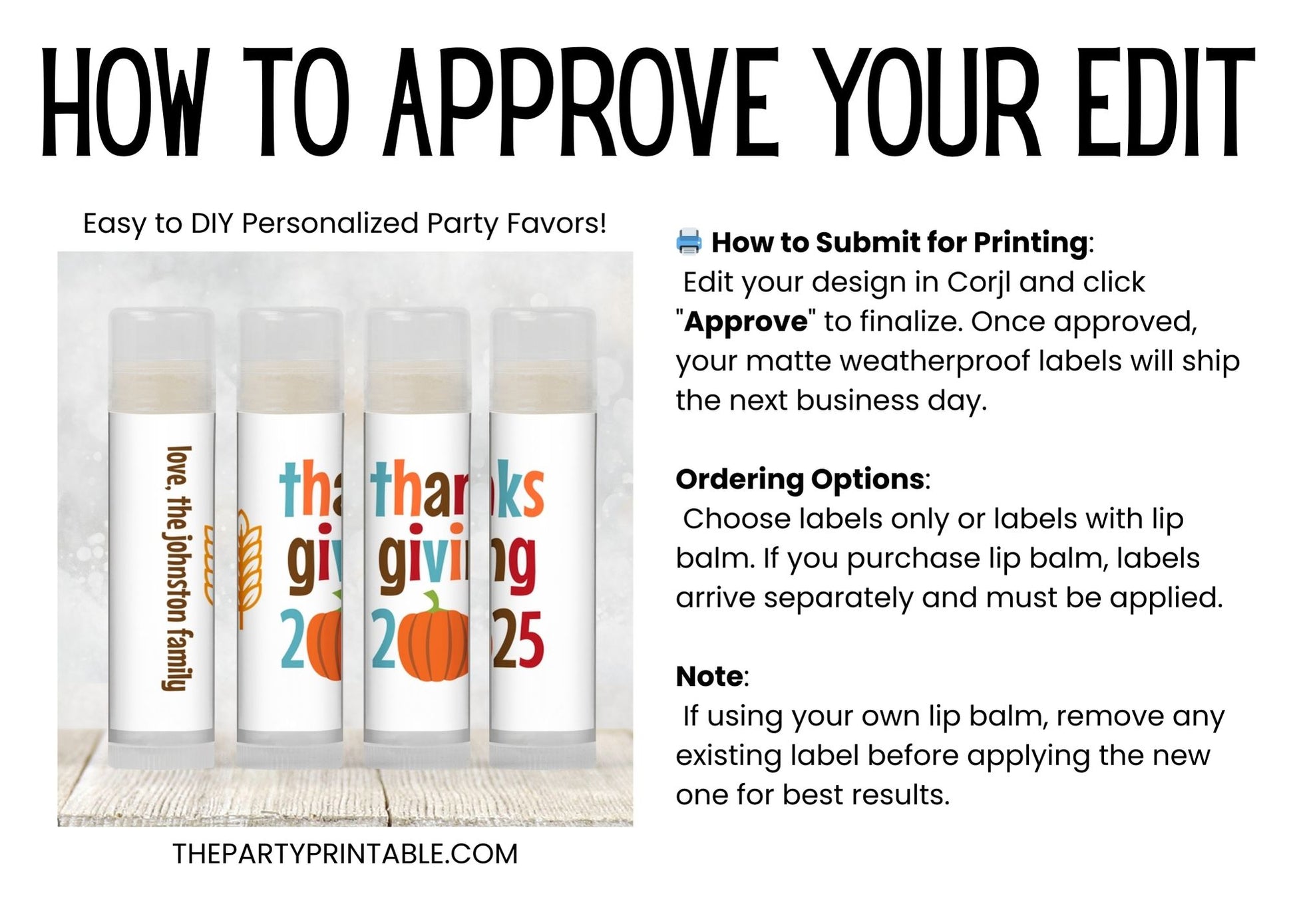 Thank your guests with these personalized Thanksgiving lip balm favors! Featuring a festive design, these chapstick favors are perfect for Thanksgiving dinner. A thoughtful and practical guest gift to place at each table setting. Choose printed favors as labels only, or upgrade to include lip balms (vanilla flavor). Labels arrive unattached for easy assembly—just peel and wrap around each balm tube. You’ll edit the design in Corjl and click “Approve.” Once approval is received, your order will be printed on matte weatherproof labels and shipped. (See specs below.)