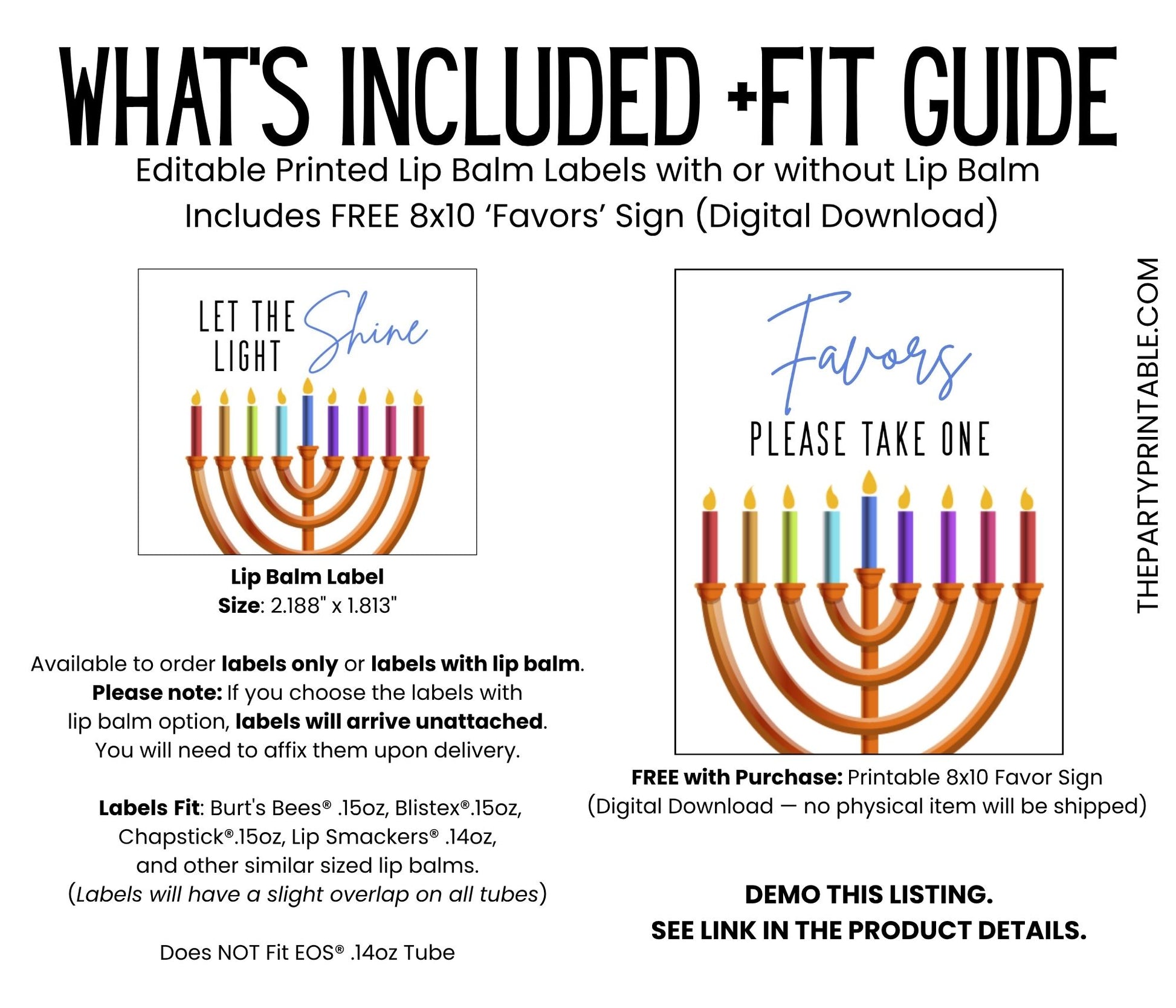 Share the joy of the Festival of Lights with these Let the Light Shine Hanukkah lip balm favors! Featuring an elegant menorah and soft glowing design, these chapstick favors make perfect gifts for women, kids, teachers, or Chanukah party guests. Choose printed favors as labels only, or upgrade to include lip balms (vanilla flavor). Labels arrive unattached for easy assembly—just peel and wrap around each balm tube. You’ll edit the design in Corjl and click “Approve.” Once approval is received, your order will be printed on matte weatherproof labels and shipped. (See specs below.)
