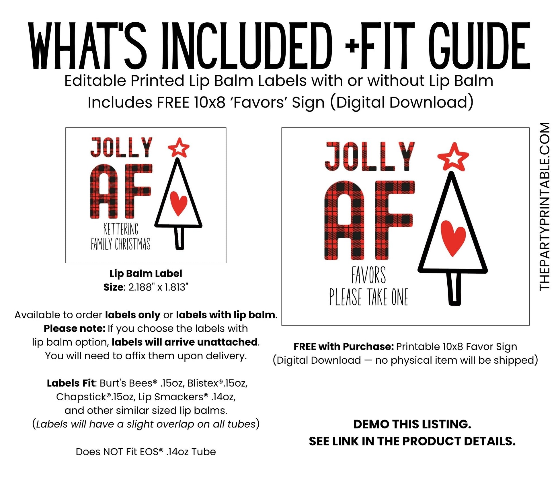Bring the laughs to your holiday celebration with these Jolly AF Christmas Party lip balm favors! Featuring a classic red and black buffalo plaid pattern, these chapstick favors make the perfect funny and festive guest gift for your Christmas party. Choose printed favors as labels only, or upgrade to include lip balms (vanilla flavor). Labels arrive unattached for easy assembly—just peel and wrap around each balm tube. You’ll edit the design in Corjl and click “Approve.” Once approval is received, your order will be printed on matte weatherproof labels and shipped. (See specs below.)